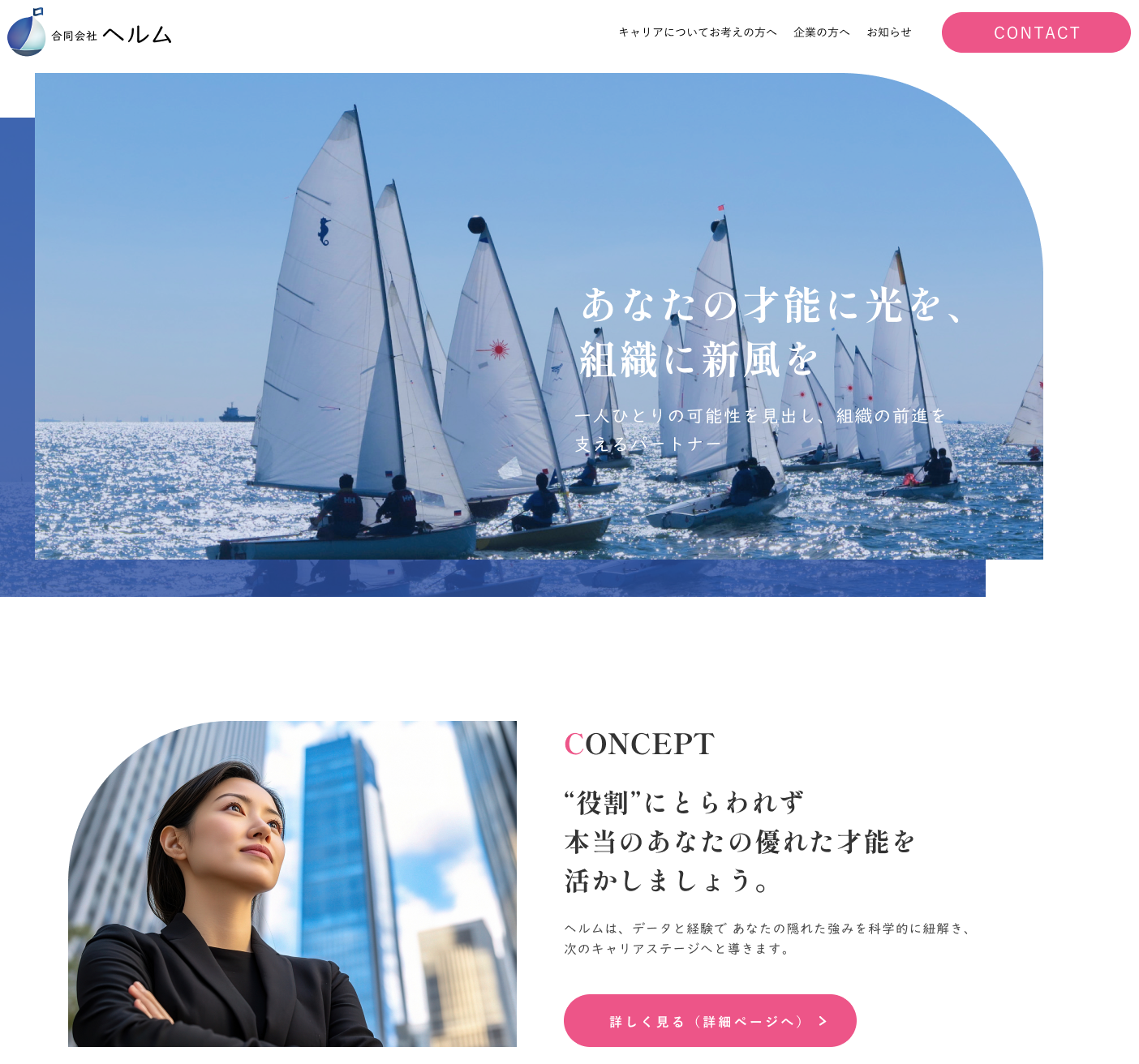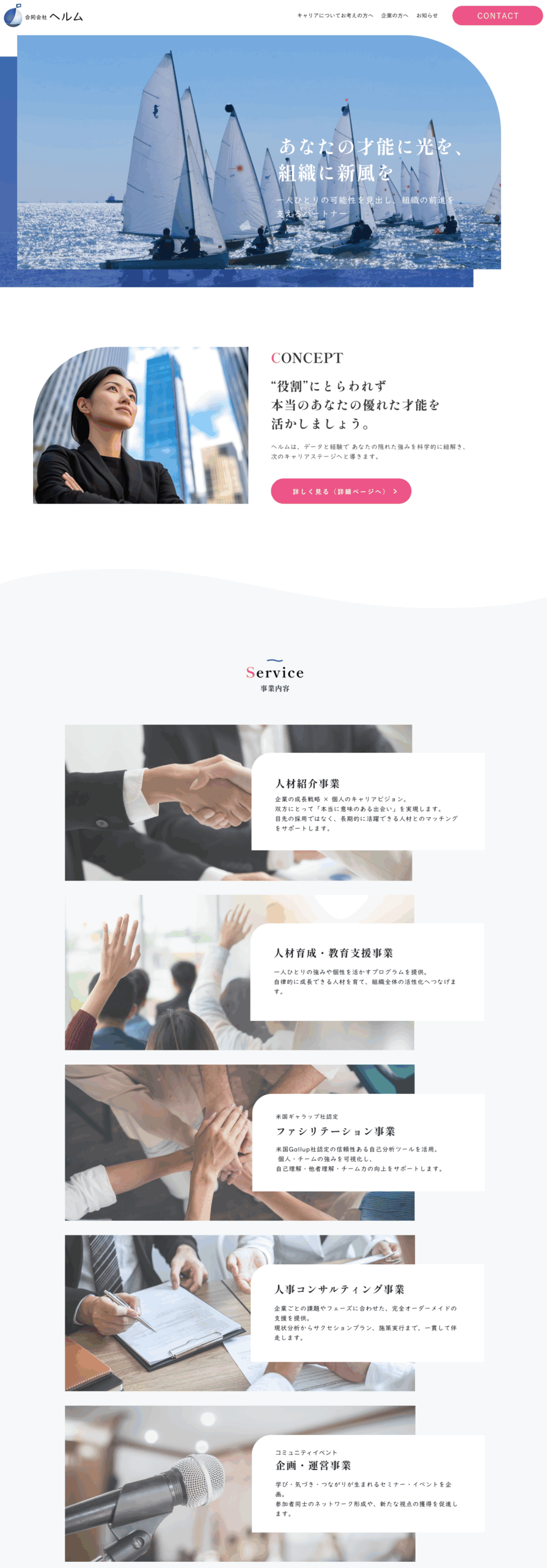 「ヒアリングをさせていただいた際、女性のキャリアについて、強い信念をもって語られる中薗様に大変感銘を受けました。 特に「自分にはこれしかできない…と思っている女性の本当の価値を世に届けたい、知ってもらいたい」という言葉が強く心に残っています。だからこそ、 中薗様の存在に背中を押される女性が多いのだと思います。 デザインについては、ロゴデザイナー、WEBデザイナーを含めたチームで対応させていただきました。会社名「Helm(舵)」に込められた「一人ひとりが望む方向へ進めるように」という想いを伺い、サイトデザインには帆や波のモチーフを取り入れました。また、中薗様の力強くも温かいお人柄もデザインに反映しております。」
